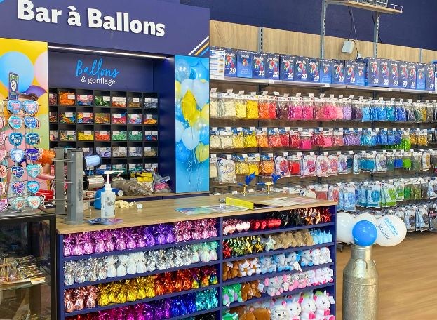 - Décorations de fête : ballons latex et aluminium, arches de ballons, guirlandes, rideaux, confettis, centres de table et vaisselle jetable.