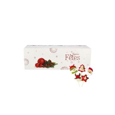 | Contenu : | 1 Boîte à bûche blanche décors rouges (30 x 11.5 x 10.5 cm) 1 semelle à bûche carton or aux dimensions adaptées (29 x 10 cm) 5 décors de Noël en feutrine sur pic (modèle aléatoire) 1 décor « Joyeuses Fêtes » (modèle aléatoire) |